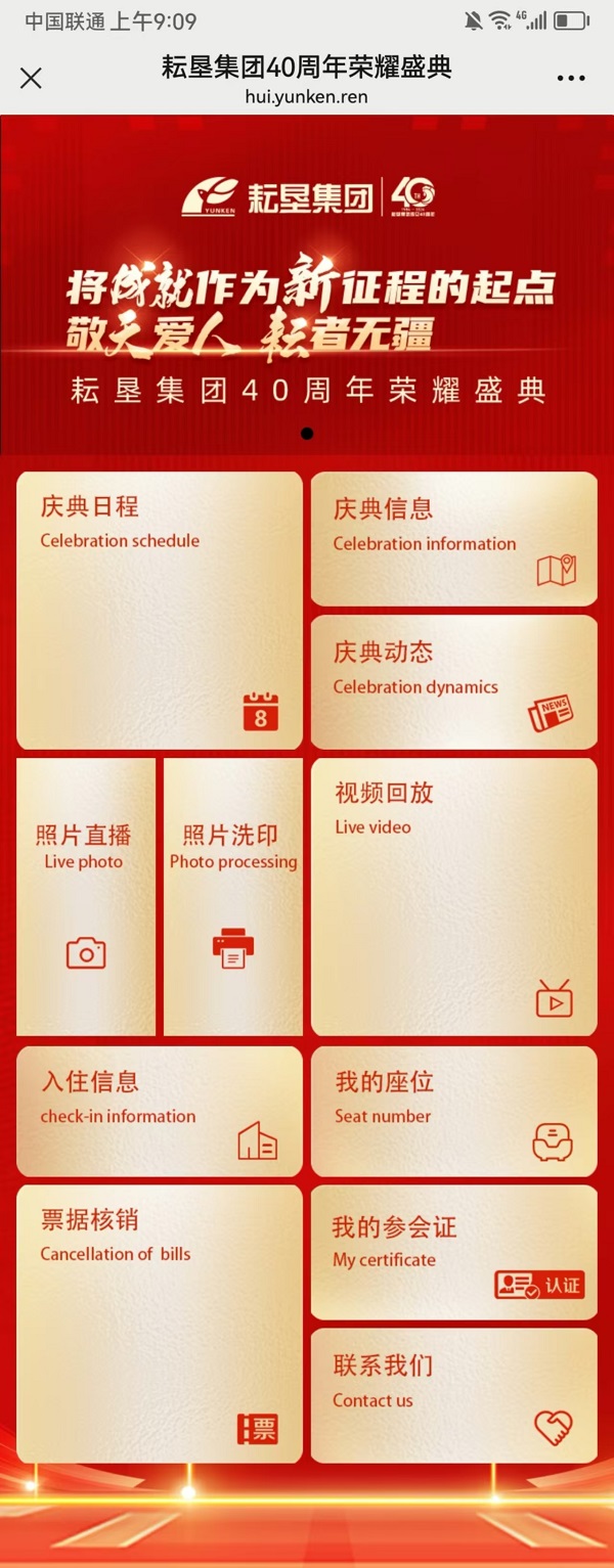 會議首頁定制內(nèi)容包括慶典日程,慶典信息,慶典動態(tài),照片直播照片洗印,視頻回放,入住信息,我的座位,票據(jù)核銷,我的參會證,聯(lián)系我們等內(nèi)容板塊。