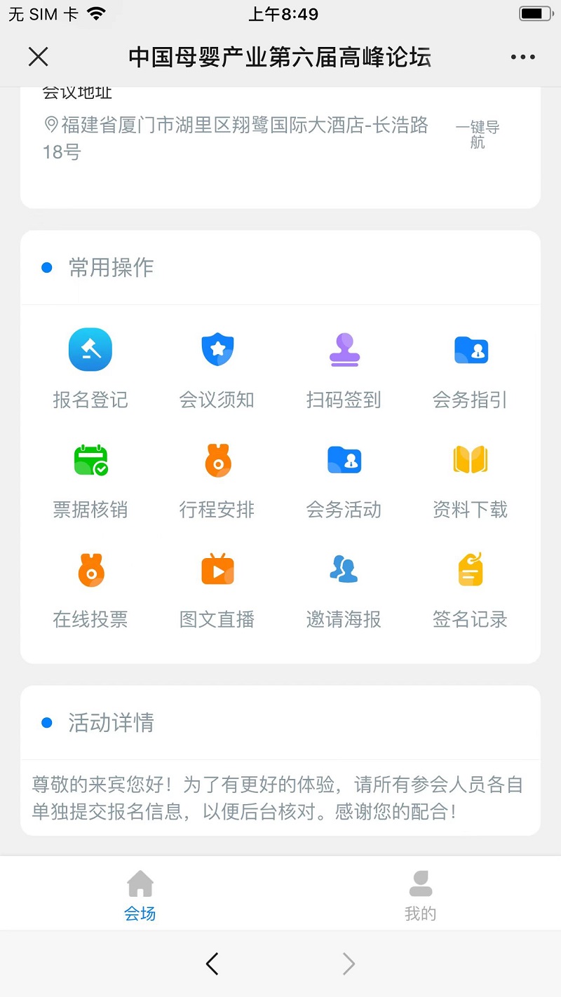 會(huì)議使用的功能有:報(bào)名登記、會(huì)議須知、掃碼簽到、會(huì)務(wù)指引、票據(jù)核銷(xiāo)、行程安排,會(huì)務(wù)活動(dòng),資料下載,在線(xiàn)投票,圖文直播,邀請(qǐng)海報(bào),簽名記錄。