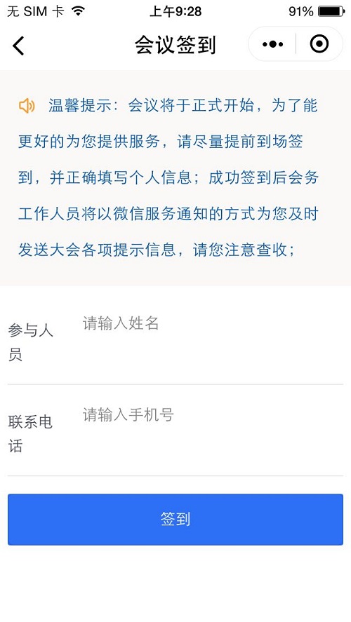 會(huì)議簽到,正確填寫個(gè)人信息,填寫參會(huì)員名字和聯(lián)系電話。