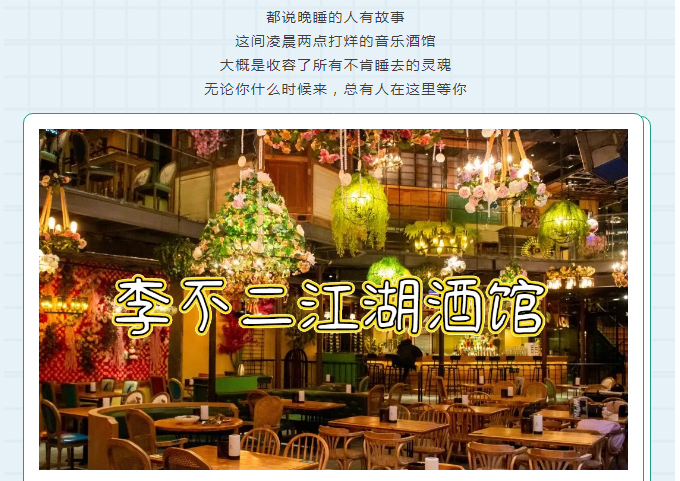 摘要:李不二江湖酒館,鬧市中心的音樂酒吧時(shí)尚與經(jīng)典并存,杯杯都是招牌沒有妹子能躲得過它,江湖菜熱辣來襲,嗨到停不下來,煙臺(tái)吃貨粉絲福利,...